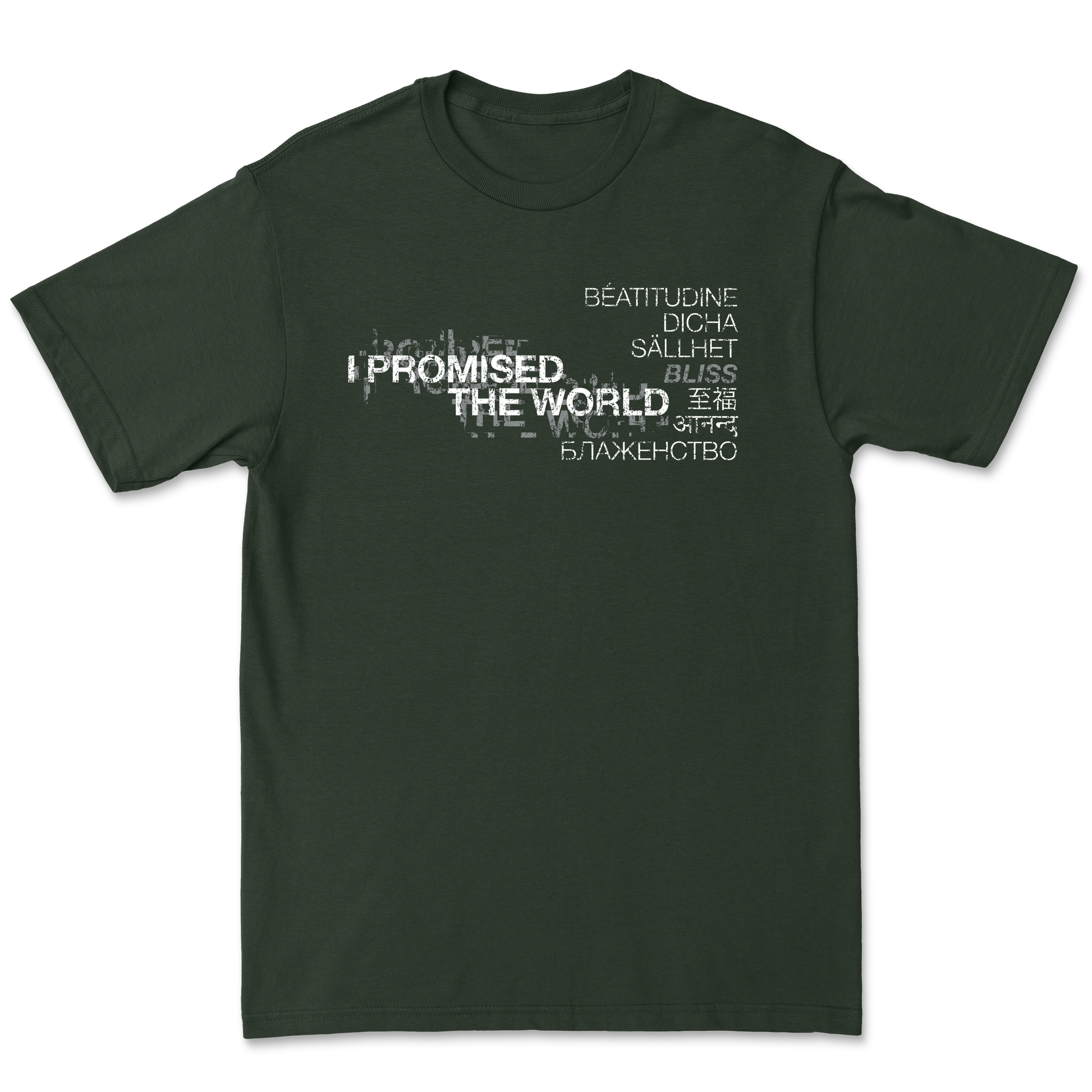 I Promised The World - 7 Languages design printed on forest green 100% cotton short sleeve t-shirt. Classic Fit.