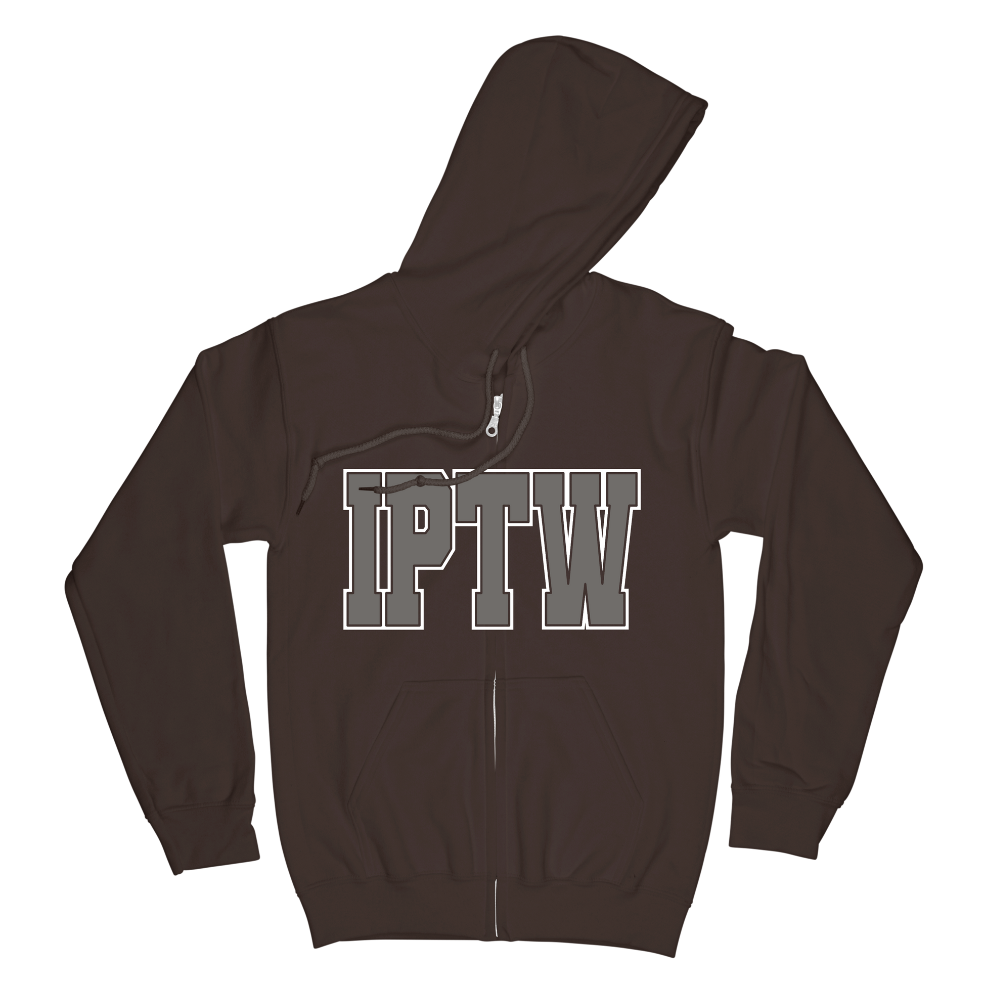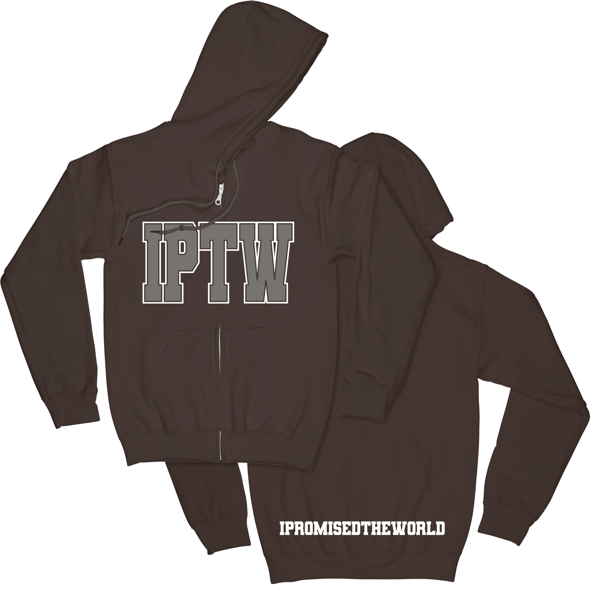 I Promised The World - IPTW design on dark chocolate 50/50 cotton/polyester zip up hoodie. Classic Fit.